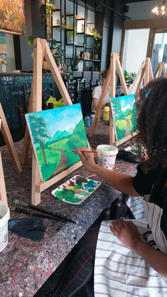 It’s all about relaxing, releasing and enjoying. This is not an art class, but total self-love at any artistic level, no judgement. You will be guided by an experienced artist. It’s like follow the leader, but you will be the master of your piece.